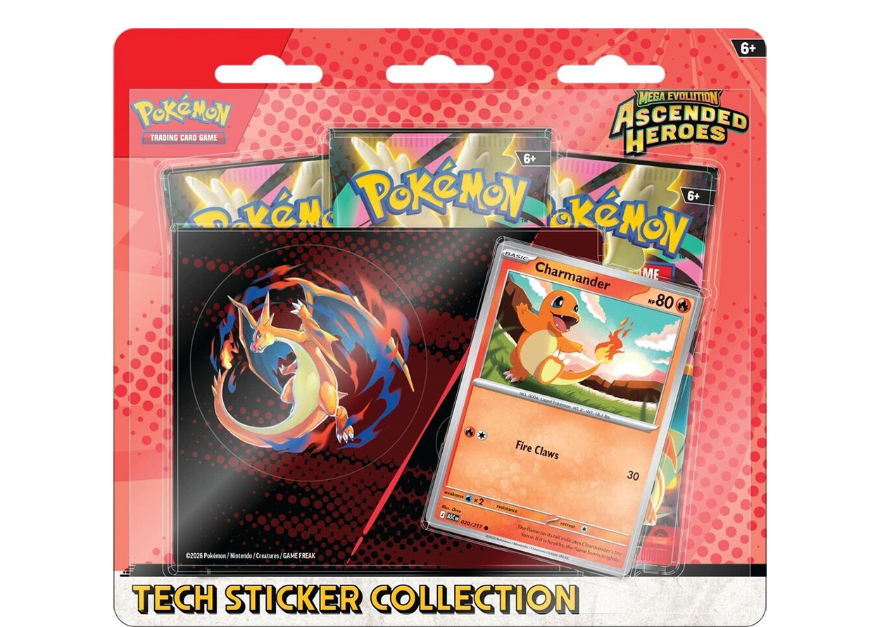 Pokémon from the Kanto region are ascending to greatness—as both promo cards and tech stickers! In this collection, you’ll find Charmander as a foil promo card, plus a sheet of tech stickers featuring Charmander and Mega Charizard Y. Top it all off with even more Pokémon inside three booster packs from the special Mega Evolution—Ascended Heroes expansion!